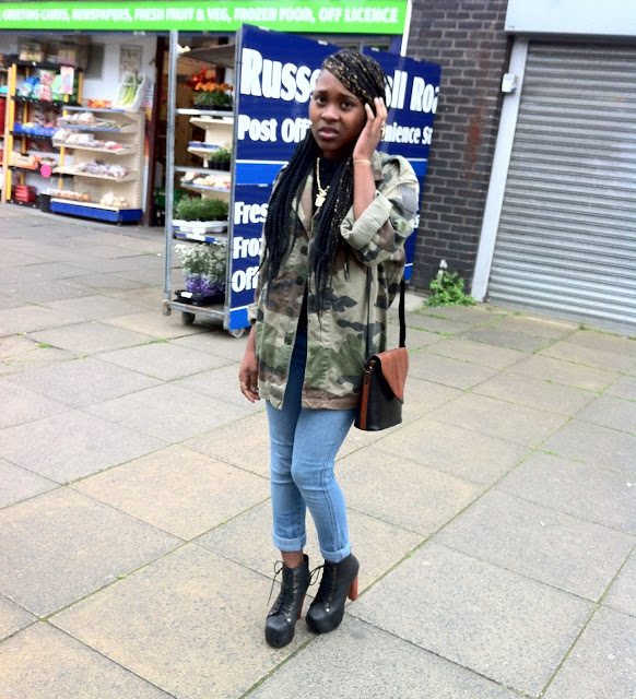 Camo and Military colors are a massive trend this autumn/ winter 2012. This was my take on the trend when I went to a friend's barbecue. It was a bit chilly so I wore jeans instead of a dress or skirt. I also teamed it with my JC litas and a vintage bag. This was over a month ago though, I'm going to be posting to update over the last few weeks. I've also had 2 hairstyle changes after this (well braids again but just black).